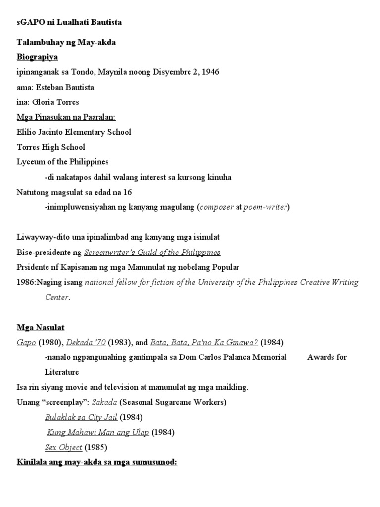 Tama na sa akin yung maligaya ako paminsan-minsan. Bautista holds back no words in expressing the effect of American colonialism in the Filipino people. Kadalasan ang mga akda niya ay nasa anyong nobela o maikling kuwento pero.