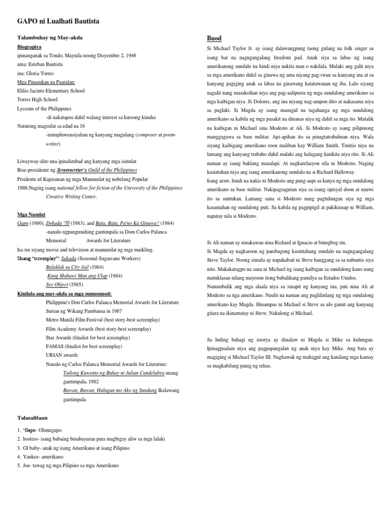 By comparison Marcos was intelligent. Posted on January 1 2014 by arieshoelace. Lualhati Bautista was born in Tondo Manila on December 2 1945 to parents Esteban Bautista and Gloria Torres.